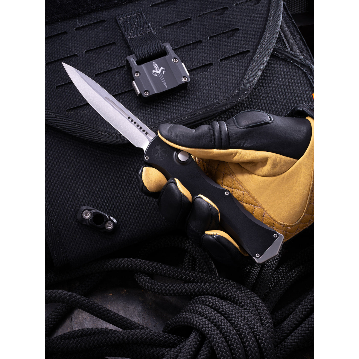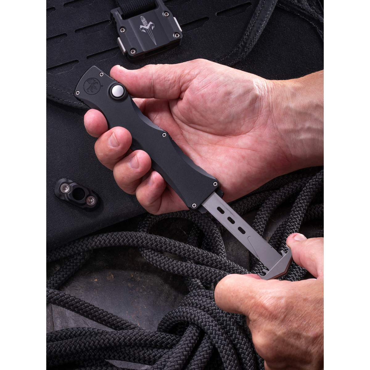 The Microtech Halo IV is a premium single-action OTF automatic knife, hand-finished to Microtech's exacting standards. Unlike Microtech's dual-action Ultratech, the Halo IV's single-action mechanism maintains constant spring pressure on the blade throughout deployment, resulting in a harder, more decisive firing action. Retraction is manual, giving the user full control over blade engagement. At 9.25" overall with a 3.85" blade ground to 0.125" thick, it strikes the ideal balance between authority and everyday carry. With the press of a button, the blade deploys clean, fast, and flawlessly secure. The streamlined 5.4" handle features jimping along the spine for a confident, no-slip grip, while the included pocket clip and standard Torx hardware keep things practical. Weighing in at just 4.13 oz, the Halo IV delivers a striking profile that defines modern tactical luxury without weighing down your pocket.