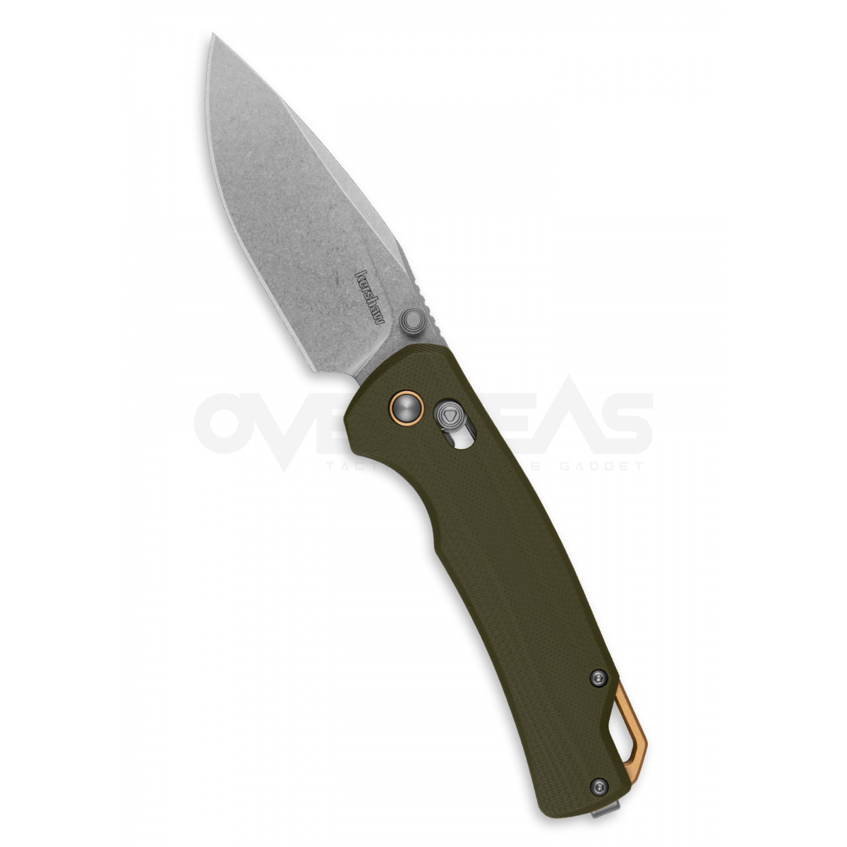 - Contoured olive G10 handle with gold-anodized aluminum trim rings and backspacer for an enhanced look and feel