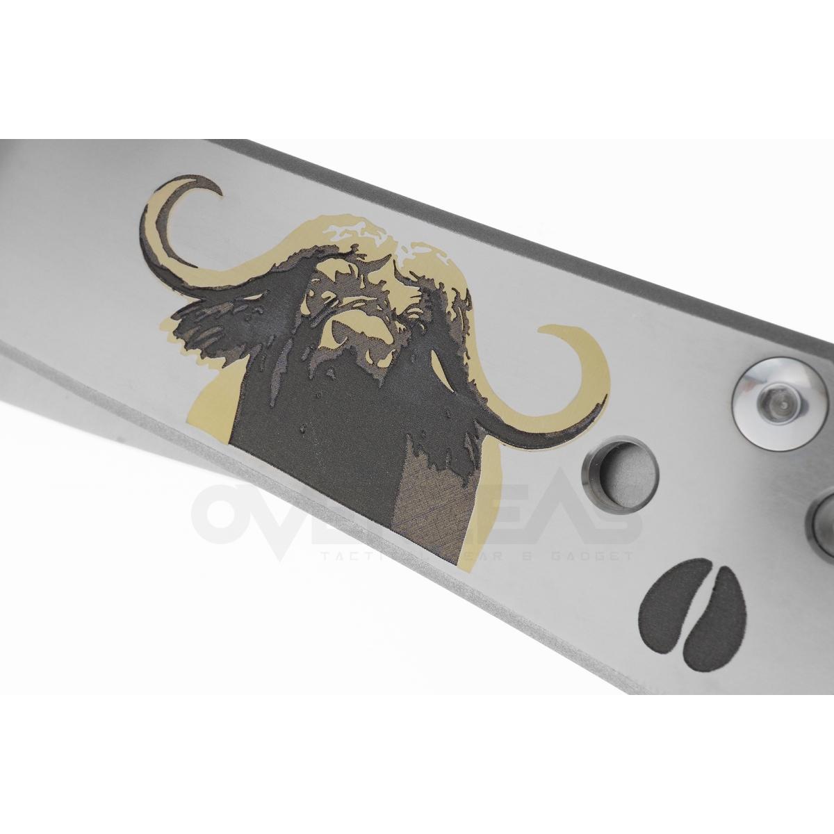 This Large Sebenza 21 features a plated titanium handle with a "Cape Buffalo" computer generated graphic (CGG). It is outfitted with a stonewashed S35VN stainless steel blade with a thumb lug. Includes lanyard and leather pouch.