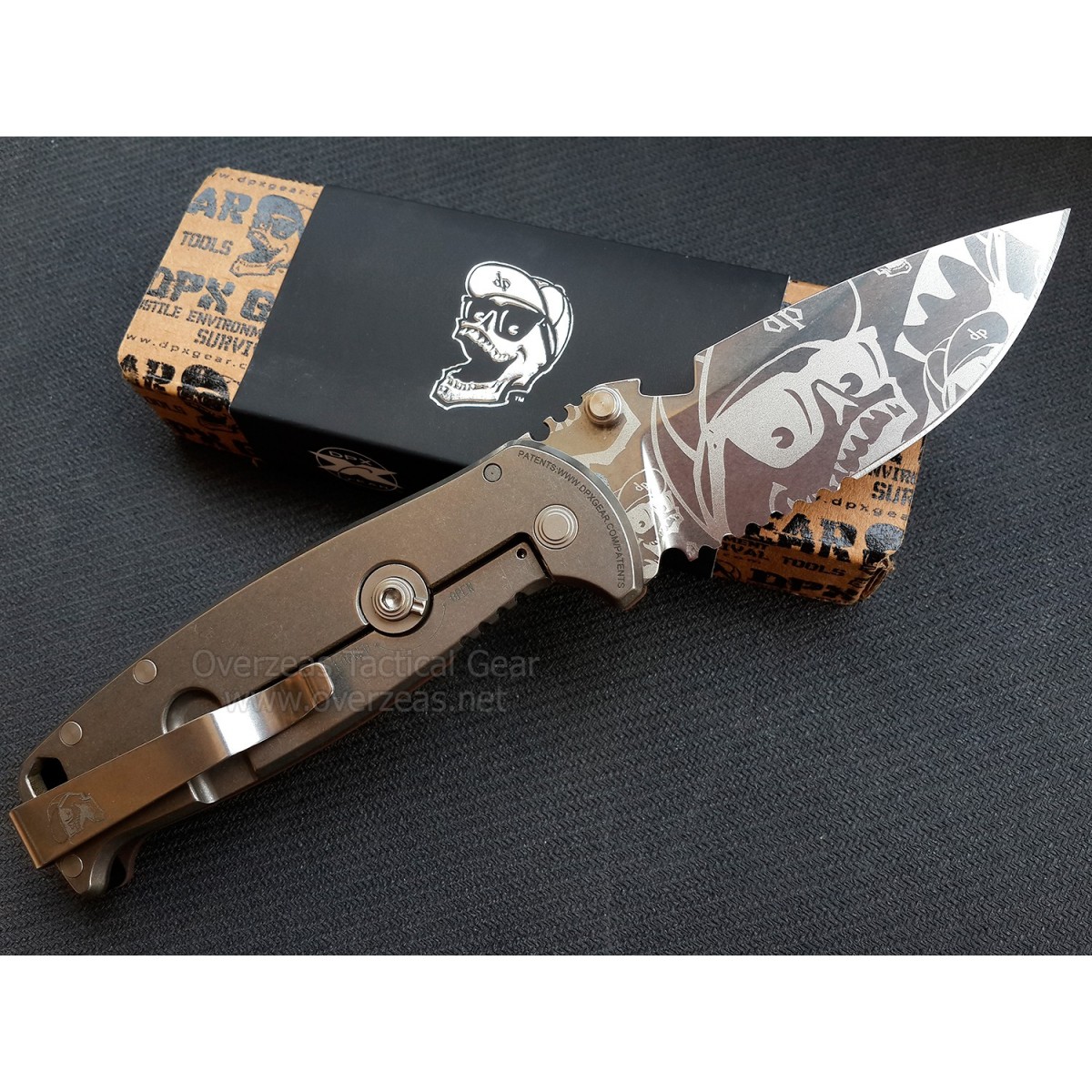 The DPx HEST/F Mr. DP Earth Brown limited edition is coolest HEST Folder yet. The knife does not require a special tool for adjusting the pivot screw or removing the clip. The knife has the Mr. DP logo CNC milled into both G10 handle scales and a repeating Mr. DP pattern laser engraved into its Milspec phosphate treated Elmax blade.